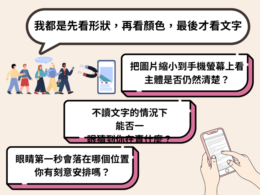 不讀字也能一眼理解主體與類別嗎?縮小到手機尺寸仍清楚嗎?
